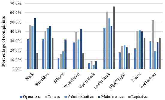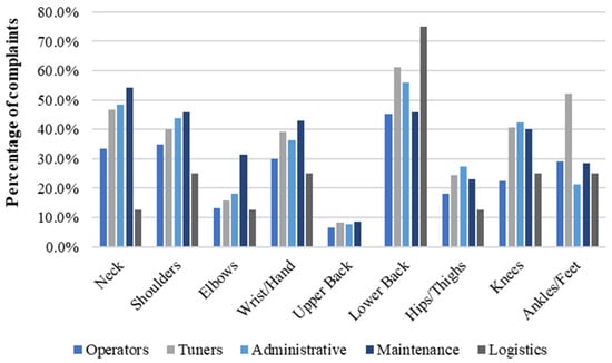 | Shoulders | [χ2 (3) = 2.710; p > 0.05]. | A Chi-square test revealed a non-significant association between job type and developing shoulder trouble. | Tuners, Administrative, and Maintenance roles are more likely to have shoulder complaints than operators. |