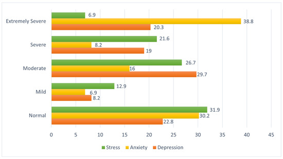 Figure 1 shows the prevalence of depression, anxiety and stress among participants in Australia. The prevalence of severe and extremely severe depression was 19% and 20.3%, respectively. The prevalence of severe and extremely severe anxiety was 8.2% and 38.8%, respectively. Finally, the prevalence of severe and extremely severe stress was 21.6% and 6.9%, respectively.