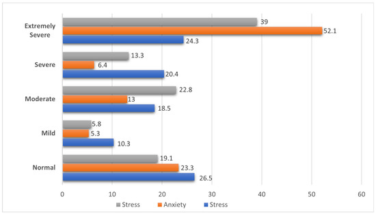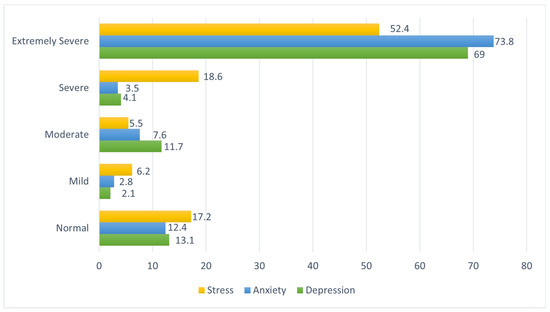 Figure 2 shows the prevalence of depression, anxiety, and stress among participants in Canada. The prevalence of severe and extremely severe depression was 4.1% and 69%, respectively. The prevalence of severe and extremely severe anxiety was 3.5% and 73.8%, respectively. Finally, the prevalence of severe and extremely severe stress was 18.6% and 52.4%, respectively.