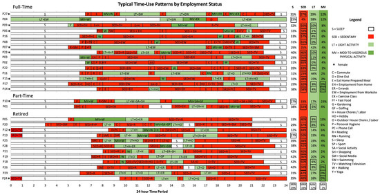 By stratifying patients by MVPA and comparing patients employed full time, part time, and retired (Figure 2), we can better understand the characteristics of the types of activities they engage in, such as the timing and location of activities throughout their day. Stratifying typical time-use patterns by MVPA and employment status (Figure 2) shows variability between patients who were employed full time (n = 15), part time (n = 2), and retired (n = 12). Patients employed full time (M = 8; F = 7) had less variability in activities throughout their day and were sedentary for longer periods of time while working in comparison to patients who were employed part time (M = 1; F = 1) or retired (M = 10; F = 2) and were engaged in many light physical activities for shorter periods of time throughout their day. Patients employed full time engaged in less MVPA throughout their day, walking at the start or end of their day. P15 described “If I’m not intentional, I’m lucky if I get twelve hundred steps in a day, like I would have to be very intentional about moving” (P15, F). Whereas retired patients engaged in more MVPA and light activities throughout their day, including different activities like sports, swimming, running errands, and house chores/labor. P12 described “well I get up, I try to get my shower going, or wash the laundry or water the flowers. Somebody may call me but in between that, I like to get out for a walk. But if I’m going down to do my laundry, I’ll get on the bike, and wait until the cycle is over and I’ll hang the load of laundry” (P12, F). Although retired patients were more active throughout the day, they were sedentary for longer periods of time at the end of their day while watching television after dinner in comparison to patients who were employed full time and part time and engaged in chores. P28 described “I’ll have supper, and I’ll usually just kind of watch shows or sports on TV. I do have a bunch of shows that I record, and I watch them after they’ve been recorded. Yeah, I’m usually relaxing, watching TV. I don’t need things. I don’t do a lot of stuff” (P28, M). In comparison, P03 described their typical evening routine as follows: “I work until late afternoon, four or five, have dinner, and then do whatever needs to be done around the home. We’ve been doing some renovations, some yard work, that sort of thing” (P03, M).