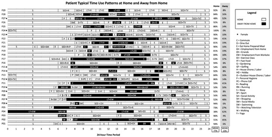 Stratifying time-use patterns by the space-time continuum of activities, such as activities occurring at home and away from home, could also help visualize differences between patient activities and overcome challenges to PA within clinical interventions. Stratifying typical time use at home and away from home (Figure 3) shows that patients spend most of their time at home (mean 77%, range 38–100%) and less time away from home (mean 23%, range 0–62%). Male and female patients self-reported similar time-use patterns at home (M = 77%, F = 76%) and away from home (M = 23%, F = 24%).