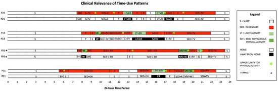 The unique contexts of time-use patterns for P01, P06, P18, and P26 show that patients spend significant portions of time sedentary with very little time spent in light PA (Figure 1). The clinical relevance of time-use patterns (Figure 4) is shown using green stars to highlight when and where intervention strategies could be used to disrupt routines and encourage patients with increasing PA, such as breaking up long periods of sedentary activity. For example, time-use patterns for P18 show that after a morning walk in their neighborhood, they are sedentary at home watching television and reading. Knowing that P18 watches the same television show at 10:00 a.m. on weekdays provides context for tailoring specific recommendations, such as encouraging P18 to gradually increase the pace and distance covered without changing the amount of time spent walking. P18 could also be encouraged to adapt sedentary activity between 11:00 a.m. to 12:30 p.m. when they are usually reading. Tailored recommendations could include encouraging P18 to listen to an audiobook while engaging in some form of light to MVPA, like a leisurely walk or housework/labor. Lastly, P18 is largely sedentary at home during the evening after dinner when they are watching television. Integrating some form of light to MVPA, like engaging in stretching and strengthening exercises while watching television, could encourage small incremental changes to established routines.