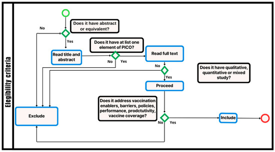 Eligibility and exclusion criteria were first applied to the abstracts of the retrieved documents, independently by at least two reviewers. When no abstract was available, the criteria were applied to the executive summary or the article’s introduction.