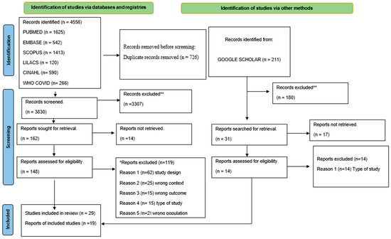 PRISMA flowchart. *: Databases excluded, **: Google Scholar excluded.