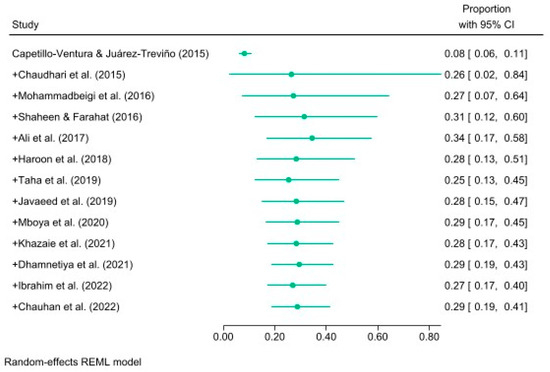 A funnel plot was used to assess publication bias by plotting logit-transformed proportions against their standard errors, with seven studies on the left and six on the right, as shown in Figure S3 in Supplementary Materials. The results of a nonparametric trim-and-fill analysis (NTFA) indicate that only one study was subjected to imputation (observed studies = 13 and imputed studies = 1; logit proportion for observed studies = −0.907, 95% CI = −1.461–−0.352; logit proportion for observed and imputed studies = −0.787, 95% CI = −1.355–−0.219). Egger’s regression test result could also be indicative of publication bias (β1= −12.31, SE of β1 = 3.24, z = −3.80, p < 0.001).