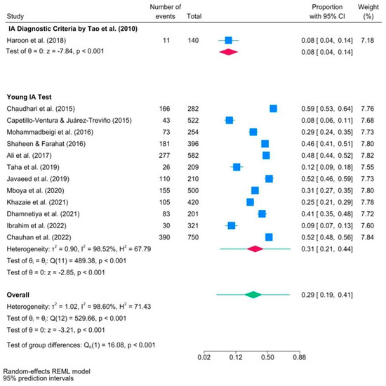 Figure 3 illustrates the results of a subgroup meta-analysis examining the prevalence of IA among medical students, classified by data collection tool. The subgroup meta-analysis revealed that the majority of the studies (n = 12) applied Young’s internet addiction test (YIAT) to diagnose IA among medical students [51]. Conversely, the study conducted by Haroon et al. (2018) [46] uniquely employed an alternative IA diagnostic tool suggested by Tao et al. (2010) [52]. The number of studies in the group using Tao’s criteria was insufficient so it was impossible to calculate the heterogeneity statistics for that group. The overall proportion of IA medical students in studies using Young’s IA test was almost one-third (95% CI) [0.21, 0.44]. The higher I2 and H2 statistics in the subgroup meta-analysis indicated significant heterogeneity among the effect sizes between the two groups, supported by the statistically significant result of the test of group differences (p < 0.001). The 95% PI for the effect size in the Young IA test subgroup was in the range of [0.21, 0.44].