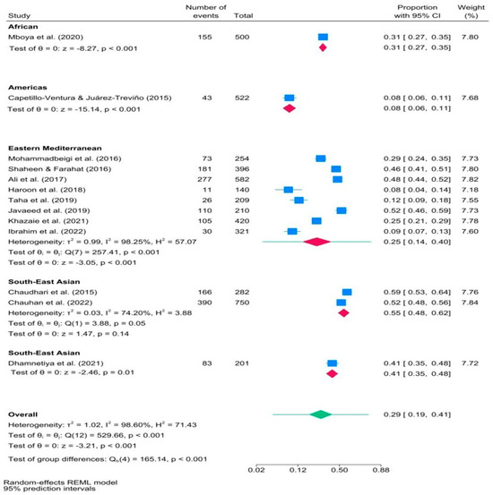 As shown in Figure 4, different proportions of medical students were affected by IA across different world regions. Southeast Asian medical students had a higher proportion of IA (about half) compared to American (less than one-tenth), Eastern Mediterranean (less than one-third), and African (approximately one-third) students. A test of group differences showed statistically significant differences in the magnitude of effect sizes among these studies (p < 0.001). The 95% PI for the effect size in the Eastern Mediterranean subgroup was in the range of [0.14, 0.40].