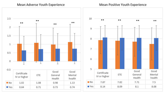 Mean Adverse and Positive Youth Experience score by outcome measure. ** Mann-Whitney U analysis, p < 0.0001.