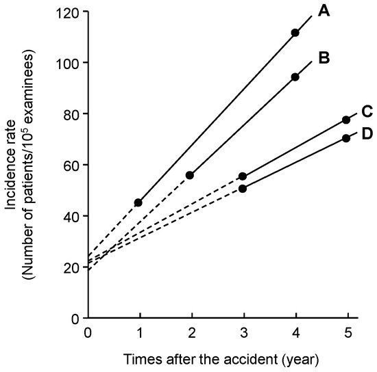 The intersection point of each extension line with the vertical axis indicates the incidence rate at the time of the accident, which was not affected by the radiation exposure. Each of the four lines intersected at almost the same point; 23.8 for A, 19.3 for B, 22.0 for C, and 22.5 for D. The mean was 21.9 ± 2.7.