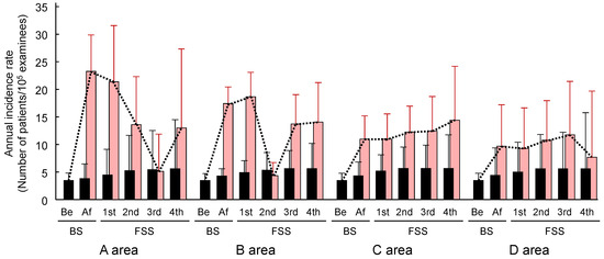 Using the above results, I could calculate the annual incidence rate of the “Common Case” at and after the accident in A, B, C, and D areas in the BS and 4 rounds of FSS. The results are shown in Table 4.