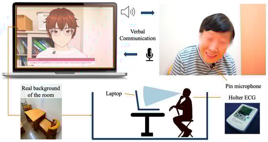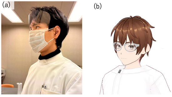 In this study, the author executed a conversation with a human being and designed the AI avatar to resemble the appearance of a person (Figure 1). The aim was to minimize the influence of the avatar’s appearance on the test results, even though there are individual differences in impressions of appearance, because using an avatar whose appearance is significantly different from the person the participants assumes would be speaking may affect the test results. The Web Speech API (Speech Recognition) [] was used for user speech recognition. Since speech recognition can be difficult when the timing of the agent’s speech and the participant’s speech overlap, we implemented a system in which the participants wear a pin microphone and speech is recognized only while a button is pressed. Responses from the system were generated using the Koeiro API [], and the AI agent’s mouth was designed to move in sync with the speech using lip-sync functionality. The quantitative data obtained was analyzed using Microsoft® Excel® 2021 MSO.