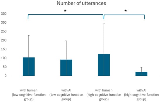 Comparison of high- and low-cognitive-function groups in terms of number of utterances. *: Significant differences were found at the 5% level.