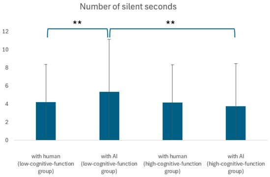 Comparison of high- and low-cognitive-function groups in terms of silent seconds. **: Significant differences were found at the 1% level.