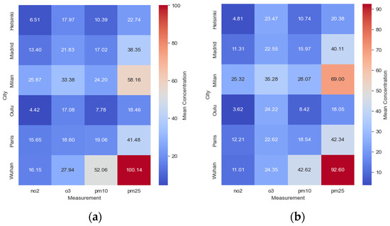 To compare average concentrations across cities and timeframes, Equation (4) [10] is used. It divides the sum of mean concentrations by the count of mean concentrations: