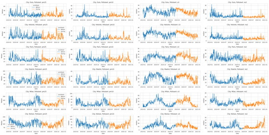 This study utilized data from the Global Air Quality Index Project (www.waqi.info, accessed on 17 December 2022), a non-profit organization established in 2007 to raise awareness about air pollution and provide global air quality information. The dataset included measurements for PM2.5, PM10, NO2, O3, and various meteorological factors. It also provided statistics such as minimum, maximum, median, and standard deviation for each pollutant. Data cleaning focused on PM2.5, PM10, NO2, and O3. The analysis specifically concentrated on the cities of Oulu, Helsinki, Paris, Madrid, Milan, and Wuhan. Periods before and during COVID-19 were labeled “Before Lockdown” (BL) and “During Lockdown” (DL). Lockdown measures varied by city. The study employed both nonparametric and parametric techniques to assess the effects of lockdowns on air quality.
