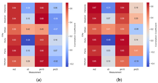In Madrid, a distinct positive correlation (r = 0.644) was found between NO2 and PM10, and a gentle positive affiliation (r = 0.147) between NO2 and O3. Similarly, O3 and PM10 displayed a mild positive correlation (r = 0.682), while O3 and PM2.5 exhibited a faint negative connection (r = −0.086). Other cities like Milan, Paris, and Oulu showed similar patterns, showcasing analogous positive correlations between NO2 and PM10, alongside weaker positive or negative connections involving NO2 and O3, as well as PM10 and PM2.5.