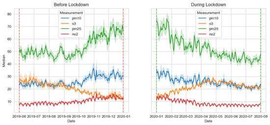 Conversely, a notable reduction in NO2 concentrations was observed during the lockdown compared to before. During the lockdown period, the average NO2 concentration decreased from 7.36 μg/m3 before the lockdown to 4.76 μg/m3. This change indicates a positive impact on air quality during the lockdown period.