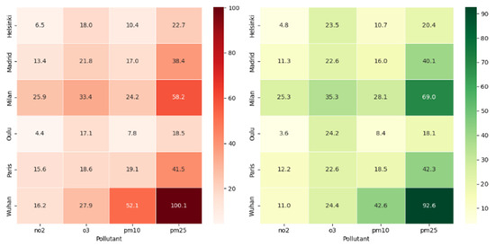 As shown in Figure 1, Helsinki’s median concentrations were as follows: NO2 (BL = 6.51 μg/m3), O3 (BL = 17.97 μg/m3), PM10 (BL = 10.39 μg/m3), and PM2.5 (BL = 22.74 μg/m3). Madrid exhibited slightly higher concentrations with medians of NO2 (BL = 13.40 μg/m3), O3 (BL = 21.83 μg/m3), PM10 (BL = 17.02 μg/m3), and PM2.5 (BL = 38.35 μg/m3). Milan had the highest concentrations among the cities, with medians of NO2 (BL = 25.87 μg/m3), O3 (BL = 33.38 μg/m3), PM10 (BL = 24.20 μg/m3), and PM2.5 (BL = 58.16 μg/m3). Oulu and Paris displayed intermediate pollution levels. Wuhan showed relatively high concentrations of NO2 (BL = 16.15 μg/m3) and PM2.5 (BL = 100.14 μg/m3), indicating poorer air quality in those categories.
