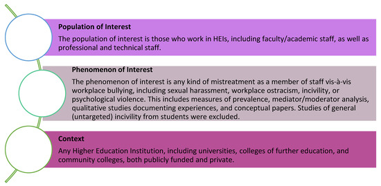 This review aims to identify the volume, range, nature, and characteristics of studies of workplace bullying in HEIs between 2003 and 2023. Furthermore, we seek to identify ‘the extent to which the specific context of HEIs is considered to contribute to the enactment of and/or the response to workplace bullying’. The PPC framework of phenomenon, context, and population was applied to structure the search strategy (see Figure 1). A wide range of terms were included to ensure the capture of various forms of bullying and harassment. We considered it important to explicitly include sexual harassment given the high levels in HEIs, recognising the argument that workplace bullying is just one face of institutionalised violence [77].