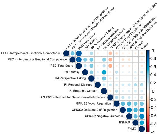 Finally, with regard to problematic internet use, significant relationships were observed between different problematic aspects, including a preference for online social interaction, deficient self-regulation, and negative outcomes. Firstly, there was a significant correlation (r = 0.263, p < 0.001) between a preference for online social interaction and mood regulation. In other words, people who tend to prefer online social interaction tend to have less effective mood regulation. Secondly, there was a highly significant positive correlation (r = 0.493, p < 0.001) between deficient self-regulation with internet use and mood regulation. This suggests that these aspects of problematic internet use are closely related. Thirdly, and even more interestingly, there was a highly significant positive correlation between problematic internet use scores (all GPIUS subscales and BSMAS score) and fear of missing out (FoMO) on social events. This suggests that those with negative internet use outcomes also tend to experience more fear of missing out on social events.