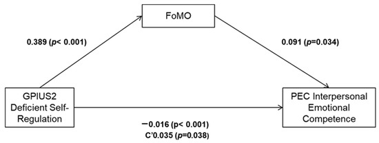 Consistent with the correlation analysis and according to the articulation of our research, we tested our last hypothesis by using a mediation model to explore the relationships between the Deficient Self-Regulation subscale of GPIUS, FoMO, and Interpersonal Emotional Competence. Analysis of the mediation model showed that the effect of Deficient Self-Regulation in Generalized Problematic Internet Use on Interpersonal Emotional Competence (offline) was mediated by FoMO. As the standardized regression coefficients for the direct effects of the variables show (Table 5, Figure 2), the GPIUS Deficient Self-Regulation was significantly related to FoMO and Interpersonal Emotional Competence. FoMO was also significantly linked to Interpersonal Emotional Competence.