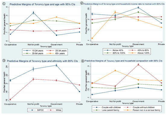 Interaction plots showing the moderating roles of (①) age, (②) household income ratio to provincial median, (③) ethnicity, and (④) household composition in the association between tenancy type and poor general health status.