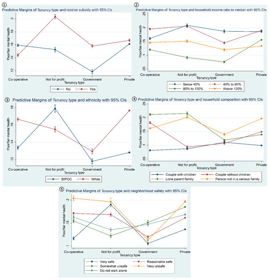 Interaction plots showing the moderating role of (①) receiving housing subsidies, (②) household income ratio to provincial median, (③) ethnicity, (④) household composition, and (⑤) neighbourhood safety in the association between tenancy type and poor mental health status.