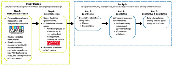 Step 1 utilized content expert researchers and practitioners to review validated instruments including measures of familiarity with NBHI terms, concepts, experience, how NBHI should be used, and the importance of components. Step 2 included concurrently collecting quantitative data and qualitative data from a convenience sample for the purpose of pilot testing the NBHI instrument. Step 3 included analyzing descriptive statistics, and Step 4 involved qualitative analysis including open coding of themes. Step 5 served the purpose of triangulation, converging, and corroborating the study findings through comparing the qualitative and quantitative data [16].
