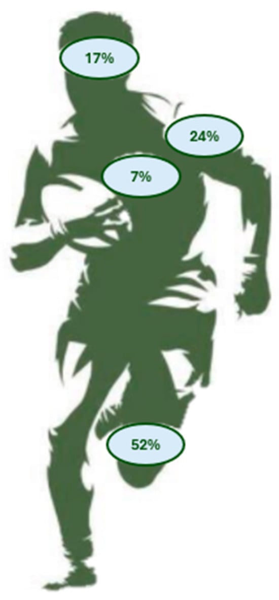 Rugbyis an emerging sport, with around 8.46 million players around the world—an increase of 11% in global participation in 2023 compared to 2022—and is played across 132 countries []. As it is characterized by high physical demands with frequent player-to-player impact and bouts of high-intensity activity, it has one of the highest injury incidence rates of all sports at the amateur and elite levels [].