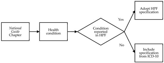 The National Guide was reviewed, and health conditions of interest were coded using the ICD-10-AM (referred to interchangeably hereafter with ICD-10 for brevity where needed). Where a condition also existed as a measure in the HPF reporting, the ICD-10 specifications utilised and published by the Australian Institute of Health and Welfare were adopted. For example, Chapter 9 of the National Guide relates to respiratory health with a subsection specifically for asthma. Section 1.04 of the HPF relates to respiratory health, and the ICD-10 specification for asthma utilised in HPF reporting (J45–J46) was adopted for the FNPHC specification also. Conversely, Chapter 5 of the National Guide relates to the health of older persons and has a subsection for falls in people 50 years and older. No such specification exists in the HPF, so the relevant ICD-10 codes W05–W10 were included in this category. Figure 1 summarises this decision process.