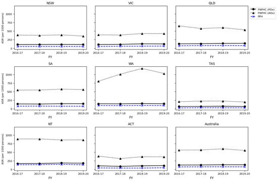 The primary care sector plays an integral and determining role in achieving these national targets [,,,,,,]; however, the data and information available on the health and well-being of Australian people are predominantly sourced from outside the primary care sector. Since 2006, the Australian Institute of Health and Welfare (AIHW) has generated Health Performance Framework (HPF) reports that provide a range of information pertaining to First Nations health and well-being outcomes, as well as factors influencing the performance of the health system [,,]. Data from hospital admissions and national health surveys feature heavily in this framework. A recent article published in this journal questioned the utility of the HPF to inform healthcare reform []. Hospitalisation for ambulatory care-sensitive conditions, also called ‘potentially preventable’ or ‘avoidable’ hospitalisations, has been used extensively as an indicator of the accessibility and overall effectiveness of primary healthcare [,,]. Specified using the International Classification of Diseases, 10th Edition, Australian Modification (ICD-10-AM), Potentially Preventable Hospitalisations (PPH) are organised into 22 diagnosis groups across 3 categories of vaccine-preventable conditions, chronic conditions and acute conditions [].