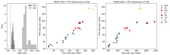 Spearman’s rank correlation coefficients between measures were not significant except for South Australia, which had a negative correlation (years with higher rates of PPH had lower rates of FNPHC; ρ = −1, p < 0.001), and for the Australian Capital Territory, which had a positive correlation (years with higher rates of PPH also had higher rates of FNPHC; ρ = 1, p < 0.001) for principal diagnoses only (Table 3). Correlating all observations by jurisdiction-year showed a positive association with PPH in both principal and additional diagnoses: jurisdictions with higher rates of PPH were statistically likely to also have higher rates of FNPHC (ρ = 0.95–0.96, p < 0.001; see Figure 3).