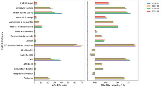Rate ratios of additional diagnoses and principal diagnoses for FNPHC categories. The second panel shows ratios on a base-10 logarithmic scale to highlight categories where principal diagnoses exceed additional diagnoses.