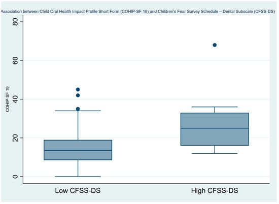 Overall, our multivariate analyses (Table 2) showed that with every one-unit increase in children’s level of dental fear (CFSS-DS) their OHRQoL decreased by 0.013 (95% CI: 0.001–0.026) and this value was statistically significant (p = 0.037). Further, children with high dental fear (CFSS-DS ≥ 38) had a lower OHRQoL (Coef.: 0.442; 95% CI: 0.050–0.835). This is depicted using a box plot in Figure 2. Lower OHRQoL was also associated with the percentage of caries, in which for every one unit increase in the percentage of caries, the OHRQoL worsened by 0.014 (95% CI: 0.003–0.025) and this value was statistically significant (p = 0.013). Finally, after adjusting for various factors such as the child’s age, sex, presence of any medical conditions, parents’ education level, parents’ smoking status, family income, patient’s weight category, presence of malocclusion, and caries percentage, no significant association was found between parental fear of dentists and poorer OHRQoL. However, this lack of association might be influenced by other unmeasured variables, or it may suggest that the effect of parental fear on children’s OHRQoL is more indirect or nuanced than initially hypothesized.