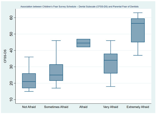 Table 3 depicts the negative binomial regression analyses on children’s level of dental fear by parental levels of dental fears and previous experiences. With every one-unit increase in the parental fear of dentists, the CFSS-DS score increased by 0.185 (95% CI: 0.146–0.224) and this value was statistically significant (p < 0.001). Figure 3 depicts a boxplot showing how CFSS-DS score increases gradually as the parent’s fear of dentists increases. Finally, parents who answered that they were anxious on their last visit to the dentist had children with higher levels of dental fear (Coef.: 0.217; 95% CI: 0.068–0.367).