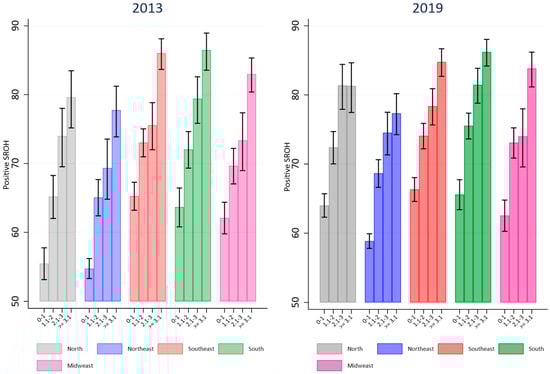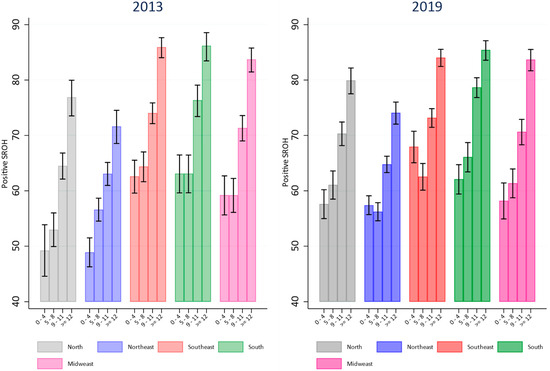 In Brazil, the prevalence of positive SROH was 67.50% and 69.68% in 2013 and 2019, respectively. A higher prevalence of positive SROH was observed among individuals with higher education (2013: 82.55; 2019: 82.15) and income (2013: 84.50; 2019: 83.9) levels compared to those with lower socioeconomic levels (education—2013: 57.11; 2019: 61.99; income—2013: 59.98; 2019: 62.93). There was a higher prevalence of positive SROH in individuals with lower education and income levels in 2019 than in 2013. The prevalence remained almost unchanged in the higher education and income group in 2019 compared to 2013 (Table 1).