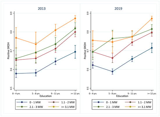 The logistic regression models are presented in the Supplementary Files (Supplementary Tables S2 and S3). A significant interaction between income and education was observed in 2019. Marginal estimates from the logistic regression model indicate that individuals with higher social advantage—greater education and income—showed the highest estimated prevalence of positive SROH in both 2013 and 2019 (Figure 3). Adults with ≥12 years of education exhibited a higher prevalence of positive SROH, even when their income was lower, compared to those with similar income but fewer years of education across both years. Conversely, individuals with lower income demonstrated a lower prevalence of positive SROH regardless of education level. In 2013, the association between income and positive SROH appeared consistent across all education categories. However, by 2019, adults with 5–8 years of education and an income of 2.1–3 MWs exhibited a higher prevalence of positive SROH than those with incomes of 0–1 MWs or 1.1–2 MWs. This pattern was not significantly different among those with 0–4 and 9–11 years of education. For individuals with 12 or more years of education, the prevalence of positive SROH was higher than that observed in individuals with lower incomes (Figure 3). The adjusted models are detailed in the supplementary files (Supplementary Tables S2 and S3).