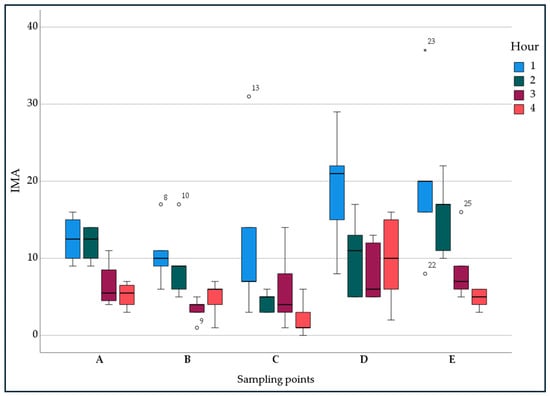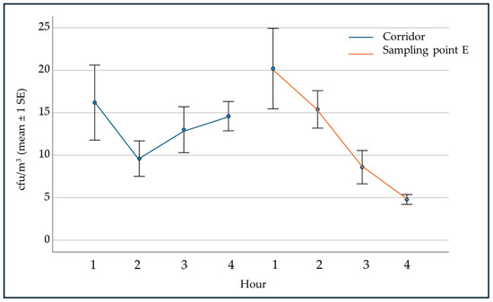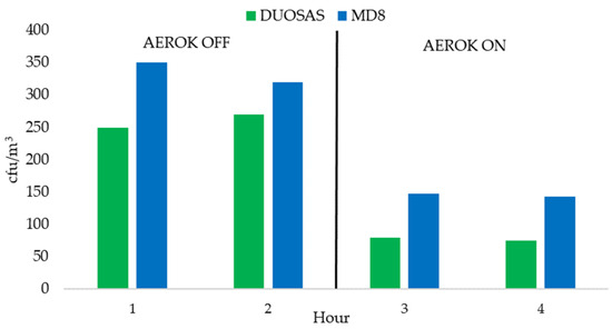 - The results obtained highlight the effectiveness of the tested device in reducing airborne microbial contamination. This effectiveness is also supported by the observation of the trend of microbial contamination detected in the room where the device was operating compared to that of the contamination detected in the adjacent corridor, with similar activity. The presence of people and their activity are the main factors that increase airborne microbial contamination [75,76,77]. Between the 1st and 2nd hour, in both environments a reduction in microbial contamination was observed, corresponding to the reduction of administrative activity; during the 3rd and 4th hours, in correspondence with the increased administrative activity, an increase in microbial contamination was observed in the corridor, while in the room with AEROK on, microbial contamination continued to decrease. Regarding passive sampling, no reduction in airborne microbial contamination was observed at points C and D, contrary to what was observed at point E, probably affected, respectively, by the presence of a copier in continuous operation and the opening of the door.