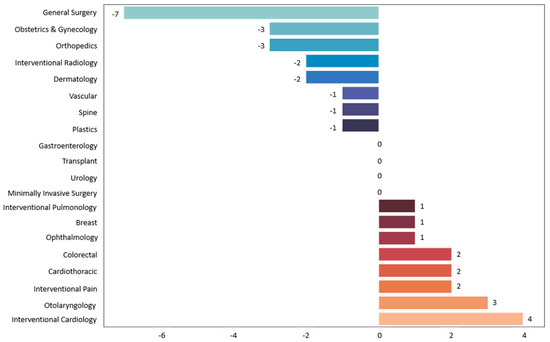 Difference between number of operations by specialty between group of patients with Long COVID and group of patients without Long COVID. Negative numbers indicate greater number of procedures in group without Long COVID symptoms, and positive numbers indicate greater number of procedures in group with Long COVID symptoms.