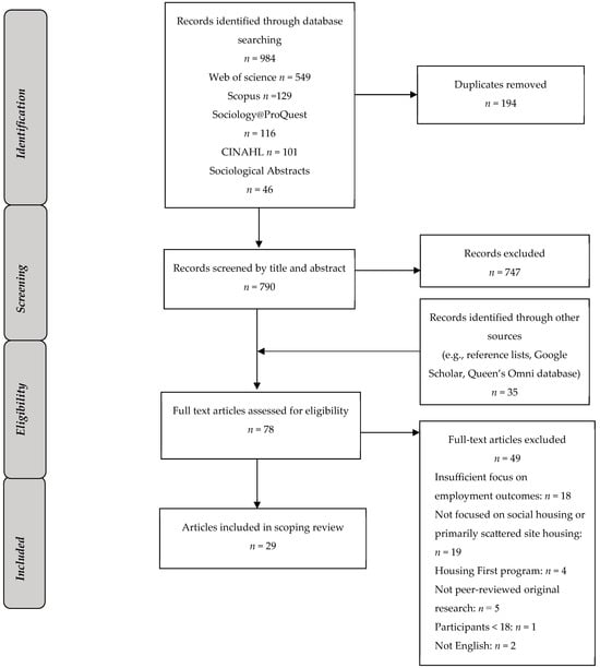 Of particular interest in this review is exploring what research has been published related to employment for adults living in the context of social housing with a view to understanding the extent and nature of the research conducted. Certainly, the relationship between employment participation and health and well-being is complex, but overall, research supports the potential positive impact of employment on an individual’s physical and mental health, social status, economic condition, and well-being in daily life [15,16,17]. As well as providing income, employment can increase self-esteem and self-confidence, provide social interactions, a sense of purpose, and positive role modelling for children [18,19]. For most working-age adults, engaging in employment is considered a critical activity of adulthood with its associated identity, roles, responsibilities, and potential opportunities. However, earlier research has suggested that housing assistance can negatively affect employment participation [20,21] and that persons residing in social housing have lower employment rates than the general population [22,23]. Social housing has sometimes been blamed for creating disincentives to work and perpetuating unemployment. Yet is social housing itself the problem, or are there factors related to the social housing environment or characteristics of people living in social housing that contribute to low employment? Additionally, what has been proposed to address barriers to employment for this population, and have they been successful? Given the significance of both housing and employment to health and well-being, we aimed to build a profile of the literature concerning employment and social housing residents in order to guide future research on this topic and to inform public policy and practice that supports employment and overall well-being for this population.