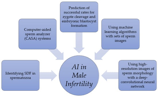 Advances in male infertility diagnostic research have also seen the involvement of artificial intelligence (AI), as in other fields of medicine (Figure 1). In this regard, the first prominent use of AI is in computer-aided sperm analyzer (CASA) systems. These are still categorized by the latest WHO Manual as “advanced examinations” for sperm evaluation, as the gold standard still appears to be a microscopic analysis performed by experienced and qualified personnel []. Using these systems allows a more objective and reproducible evaluation of the seminal fluid examination and a better assessment of the sperm’s kinetic parameters []. However, several limitations, such as the lack of standardization and the poor accuracy in assessing the sperm morphology and concentration in samples with high viscosity, severe oligozoospermia, or in the presence of many round cells, debris, and agglutination, prevent their routine use []. More recently, an integrated system of autofocus optical technology, AI algorithms, and electronic engineering mechanical systems have resulted in compact, rapid, observer-independent, and highly accurate CASA systems. A recent study demonstrated, with one such system, a good reliability and accuracy after comparison with a manually performed semen examination []. This suggests that the increasing enhancement of the algorithms integrated into these systems will increase their performance, improving the standardization, speed of execution, and objectivity of sperm analyses [].