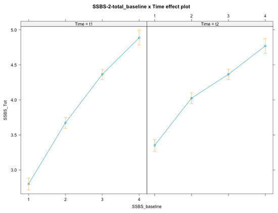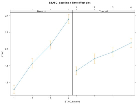 Time × baseline level interactions were found [F(3, 348) = 37.99, p < 0.001] (Figure 6), with students from both levels 3 (B = −0.33, SE = 0.09, t(348) = −3.681, p < 0.001, 95% CI [−0.49, −0.15]) and 4 (B = −0.33, SE = 0.10, t(348) = −3.217, p = 0.001, 95% CI [−0.53, −0.13]) revealing a decrease in anxiety compared to level-1 students, who slightly increased their anxiety level following the intervention. Globally, over time, students who had lower baseline levels of anxiety increased their anxiety level (although remaining at an overall lower level; Bt1 = 1.52, Bt2 = 1.74), while students with higher baseline levels of anxiety decreased their anxiety levels following the intervention (3rd tier: Bt1 = 2.05, Bt2 = 1.96; 4th tier: Bt1 = 2.36, Bt2 = 2.07). No interaction effects were found for gender or SES.