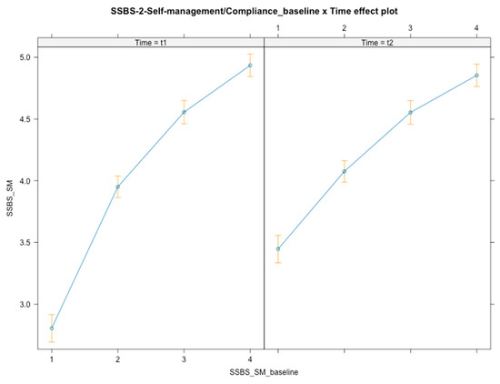 Graphical representation of interaction effects (time × baseline level) on self-management/compliance.
