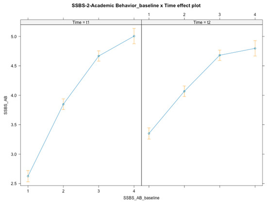 Graphical representation of interaction effects (time × baseline level) on academic behavior.