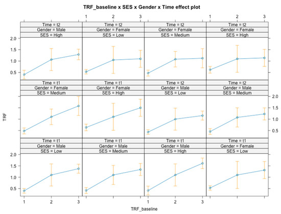 Analysis of the Q-Q plots provides evidence that the data presented a tendency toward a normal distribution (i.e., |z| < 3) [65] and were not impacted by outliers, thus allowing for the use of parametric statistical analysis. Regarding missing data, the Little’s MCAR test revealed that missing data were not distributed completely at random [χ2 (41,718) = 43,559.473, p < 0.001]. Additionally, for some items, the percentage of missing data was above 5%. This suggests that the missingness is related to the observed data. Thus, to handle missing data, the expectation–maximization (EM) technique was used to estimate and input missing values, since it is a widely used and powerful technique in statistics [66]. A one-way ANOVA was conducted to test baseline differences across gender and SES. Effect sizes were calculated as partial eta-squared (ηp2) and were interpreted as small, medium, and large effects, respectively, for values of 0.01, 0.06, and 0.14. To test for the interaction effect of the baseline level of the assessed variables, participants were categorized into 4 levels defined based on the pre-test quartiles (level 1, below 1st quartile; level 2, between 1st and 2nd quartiles; level 3, between 2nd and 3rd quartiles; and level 4, above 3rd quartile). Data analyses were conducted using linear mixed-effects models with lme4 [67] and lmerTest [68] packages in R-Studio (Version 4.4.1) [69]. Participants were included as random effects, whereas time, gender, baseline level of the assessed variables, and SES level were included as fixed effects. Confidence intervals were computed using the “boot” R package [70]. A follow-up simple slope analysis was conducted to explore significant interactions. No part of the study analysis was pre-registered prior to the research being conducted.