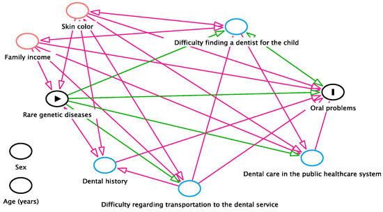 A directed acyclic graph (DAG) was used as a visual method of representation of causal presuppositions. This method selects covariables for statistical adjustment and identifies confounding factors for the causal relationship in question [11,27]. To identify possible confounding variables, the authors included some sociodemographic characteristics, dental history, and clinical conditions in the study (skin color, family income, dental history, dental care in the public healthcare system, difficulty finding a dentist for the child, difficulty regarding transportation to the dental service, and oral problems). As the participants in the two groups were matched for age and sex, these variables were not incorporated into the DAG. Based on the described theoretical model, skin color and family income were identified as confounders of the association between rare genetic conditions and oral problems (Figure 1).