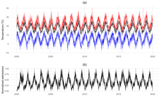 Patterns of (a) daily maximum temperatures and (b) daily child hospital admissions from 2000 to 2019. (Note: meshblock-level aggregation for maximum of daily maximum temperature (red), minimum of daily maximum temperature (blue), and population-weighted average of daily maximum temperature (black); daily child admission counts were processed by seasonal-trend decomposition based on LOESS before normalizing to each year’s value between 0 and 1).
