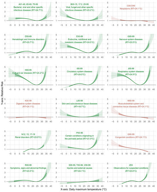Temperature–response curves (cumulative lag 0–21 days) for child admissions in 2000–2019, stratified by ICD categories. (Note: 95% CI are shaded. Model-predicted RR and 95% CI beyond observable temperature range for admissions are in dotted line and lighter shade. For C00-D49, K00-99, M00-99, Q00-99, and S00-V99, reference temperature (RT) of 24.1 °C from the main model was used because minimal RR was not reached. Green: ICD codes selected to define heat-related causes. Brown: ICD codes not selected as part of heat-related causes).