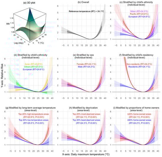 We estimated relative risks (RRs) of hospital admission relative to the reference temperature at which the risk of hospital admission is minimised. We fitted models stratified by individual-level factors, including ethnicity (total responses in Māori; Pacific Peoples; Asian; sole European; and Other for all other residual groups, including ethnic groups from the Middle East, Latin America, and Africa), sex (male, female), and residency (resident, non-resident). Additionally, we explored interaction effects for area-level factors, including population-weighted long-term average temperature, socioeconomic deprivation (using population-weighted average NZDep2013 scores), and home ownership (categorized by proportions of home-owning households, as detailed in Supplemental Figure S3). This approach provides an indirect estimation by testing one hypothesis at a time and separately exploring the effects at low or high levels of these factors. For cases where minimised RRs were not observed, we confined the reference temperature to within ±3 °C of the main model’s reference temperature.