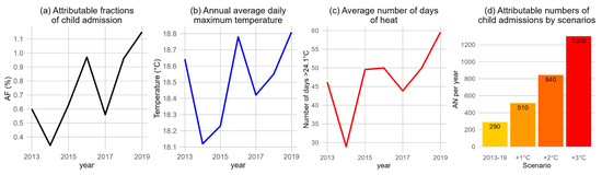 Figure 4d shows that between 2013 and 2019, on average, there were 290 child admissions per year due to heat effects exceeding 24.1 °C. If daily maximum temperatures are to rise by 1 °C, 2 °C, and 3 °C due to climate change, these admissions are projected to increase to 510, 840, and 1300, respectively. The areas more exposed to higher temperatures (Supplemental Figure S8) are projected to be more impacted by further increases in temperature.